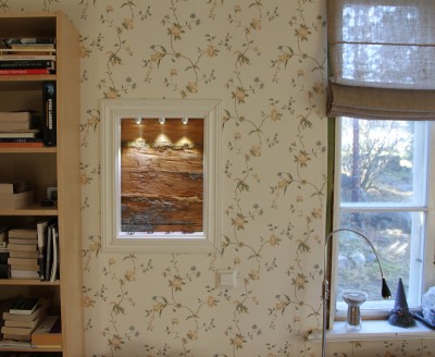 Äntligen skulle ramen kring den bygghistoriska tavlan (se tillbaka på http://husohemskt.thastrom.net/#post67) i sovrummet sättas dit! Det profilhyvlade fodret har legat säkert ett helt år och väntat. Sen har det målats noga med flera strykninigar. Och så tog jag mått på längden och tvären och sågade till i bästa gersågen – den manuella med fintandat blad. Perfekt passform! Och så började jag spika upp…